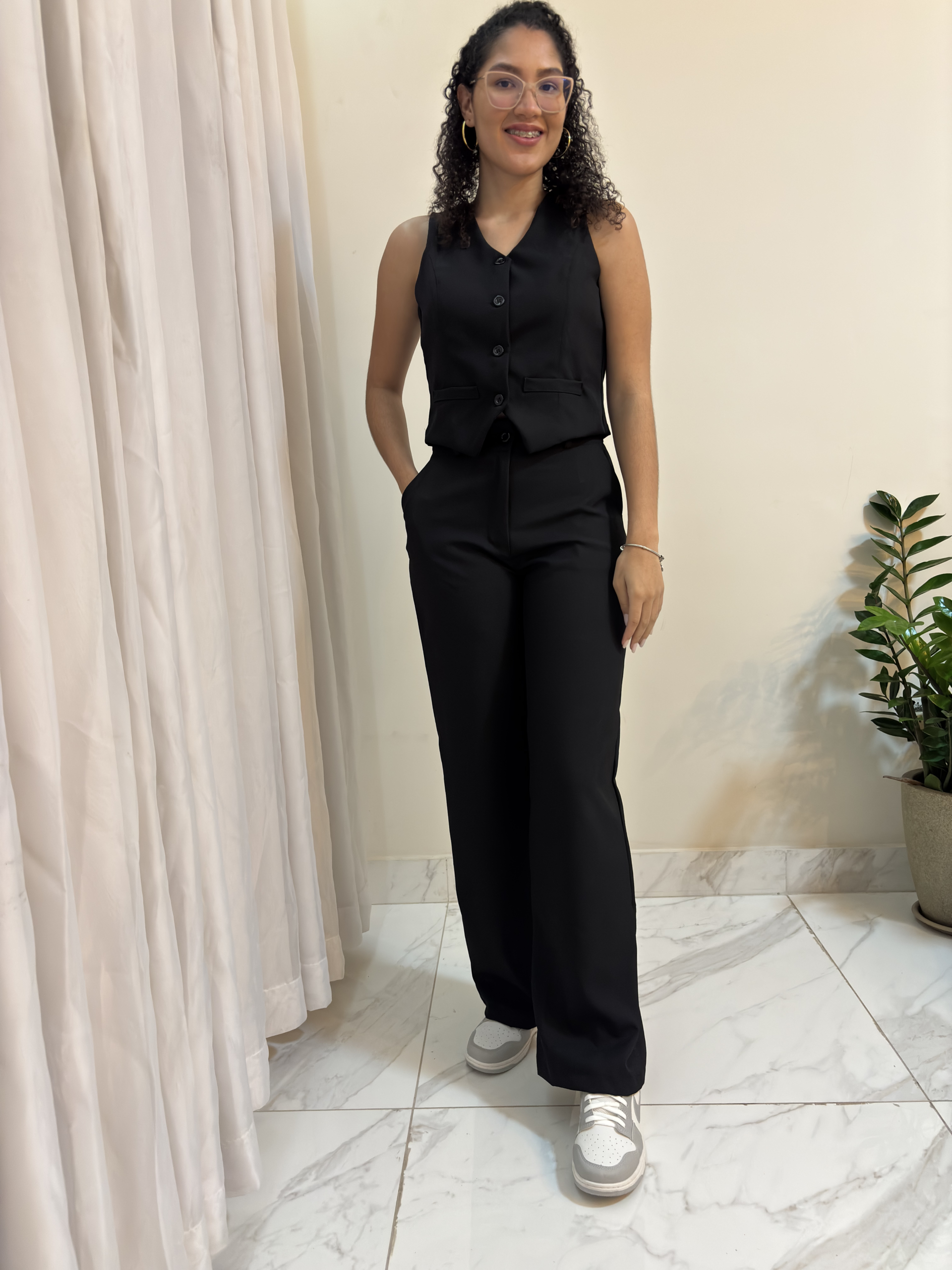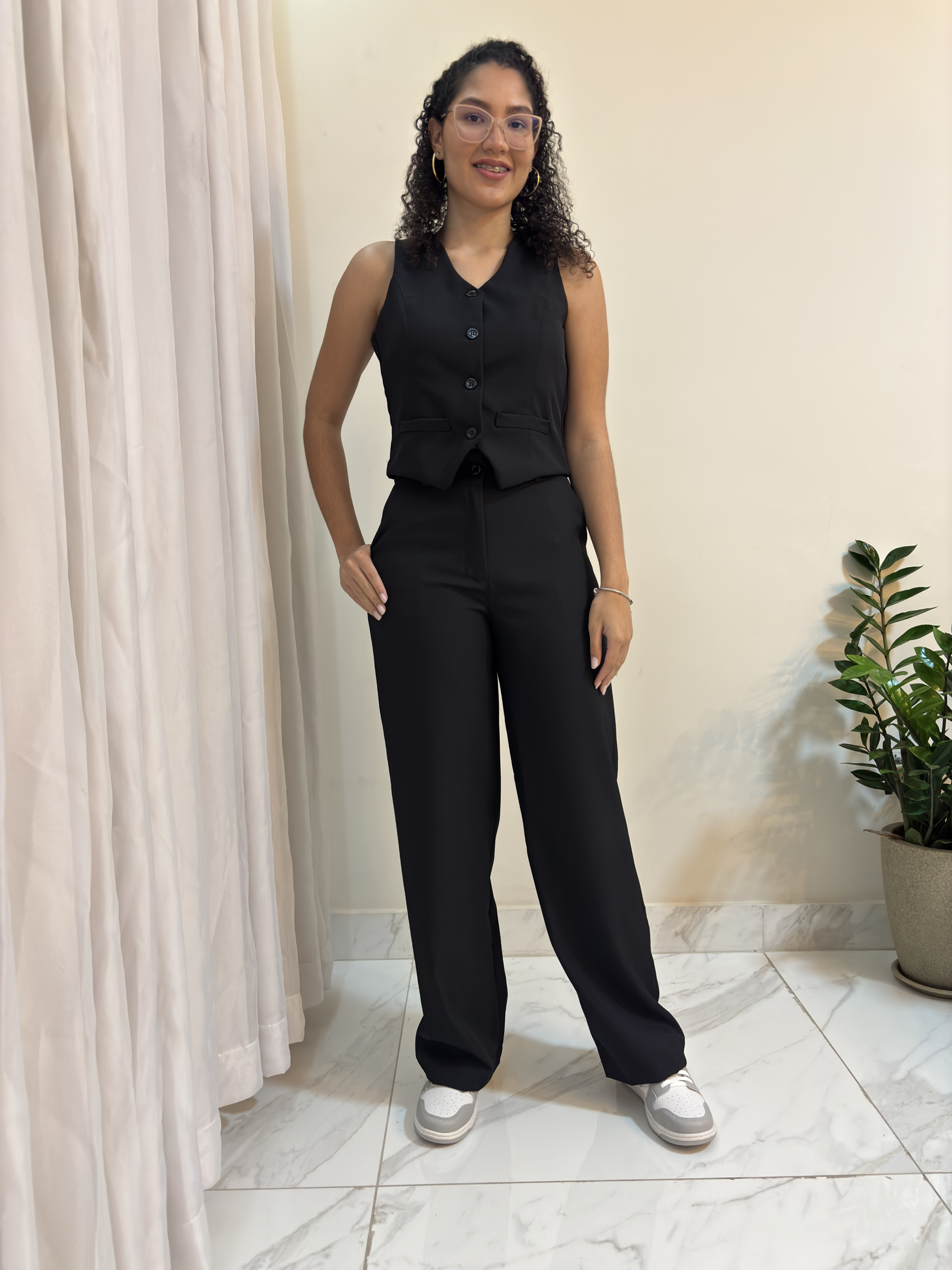 Conjunto feminino de alfaiataria composto por colete e calça pantalona de cintura alta. O colete possui modelagem ajustada, abotoamento frontal e bolsos decorativos, ideal para criar produções modernas e sofisticadas. A calça tem corte reto, caimento fluido e cós largo na cintura, proporcionando conforto e elegância.